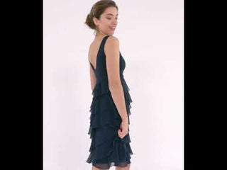 Cocktail jurk met prachtige lagen die schuin lopen over het lijf waardoor dit een mooi zweirig effect geeft. De jurk heeft een ronde hals, is mouwloos en heeft een ritssluiting aan de zijkant. Aan de achterkant heeft de jurk een v-hals opening.