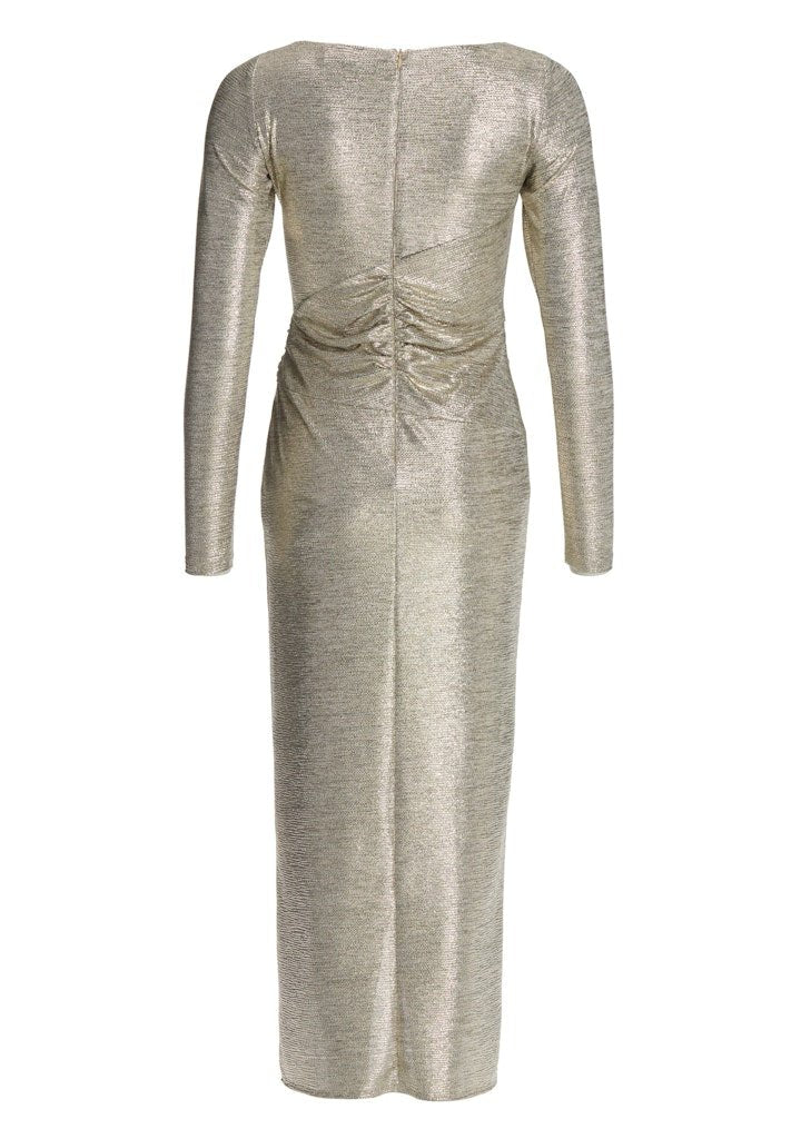 Deze elegante gouden midi jurk is de perfecte keuze voor een feestelijke gelegenheid. De subtiele glans van de stof geeft de jurk een luxe uitstraling, terwijl de aangesloten pasvorm het silhouet prachtig accentueert. Het verfijnde plooidetail in de taille zorgt voor een flatterend effect en benadrukt op elegante wijze de vrouwelijke vormen.
