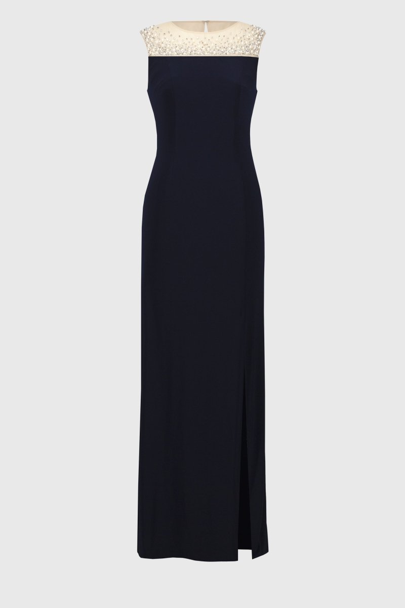 Op zoek naar een adembenemende look voor jouw volgende evenement? Deze schitterende mouwloze maxi-jurk uit de Signature Collectie is alles wat je nodig hebt. Het opvallende ontwerp kenmerkt zich door een nude mesh bovenstuk dat rijkelijk is versierd met parel- en zilverkleurige ombre-kralen. De elegante uitstraling wordt verder versterkt door de verleidelijke split aan de voorkant en de stijlvolle keyhole-detail aan de achterzijde.
