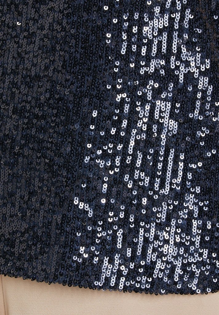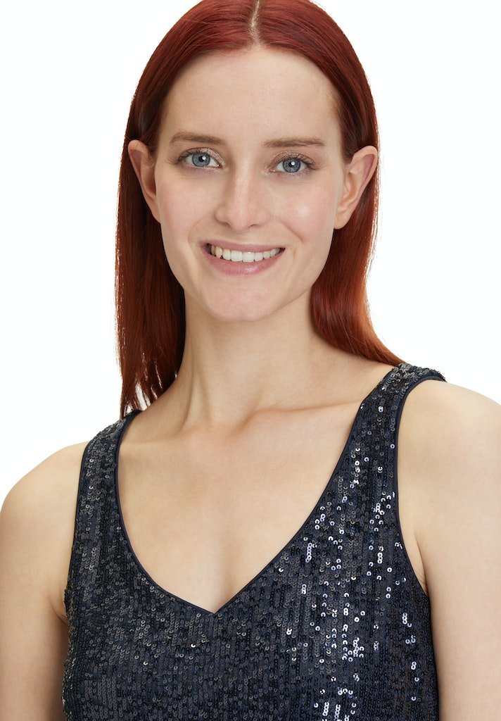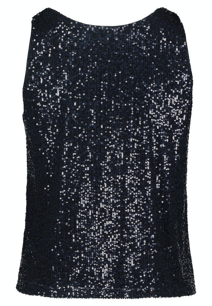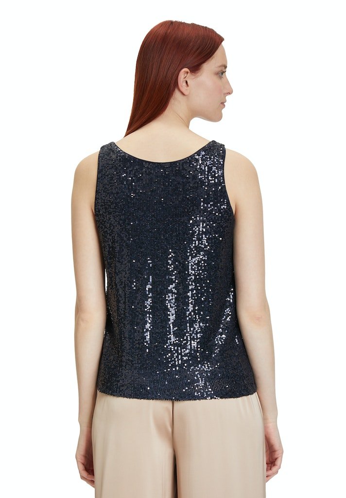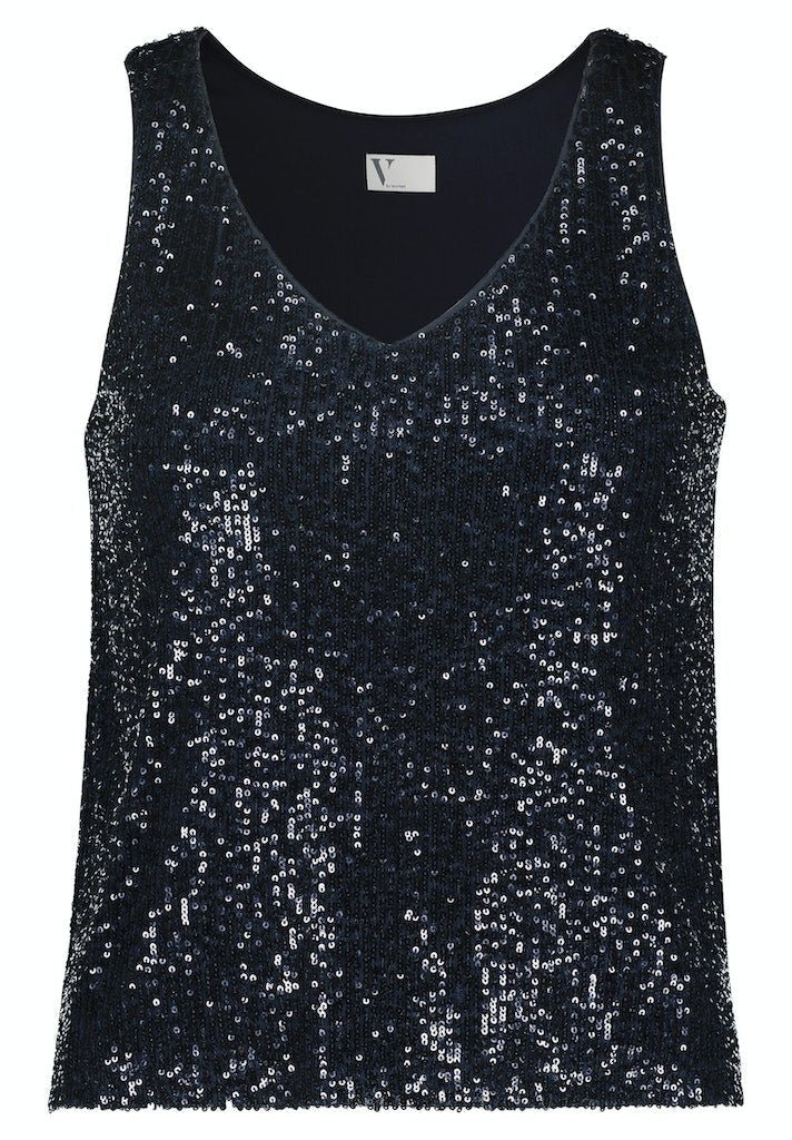Deze elegante top van V by Vera Mont is een absolute blikvanger voor elke feestelijke gelegenheid. De top is volledig bedekt met fonkelende donkerblauwe pailletten die een luxe, glinsterend effect creëren bij elke beweging. De diepe V-hals en mouwloze snit zorgen voor een vrouwelijke en flatterende uitstraling, terwijl de rechte pasvorm comfortabel en stijlvol om het lichaam valt.