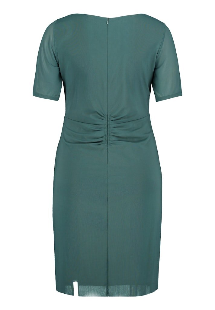 De V-hals en de subtiele overslag aan de voorzijde zorgen voor een vrouwelijk silhouet, terwijl de verfijnde plooien in de taille een flatterend effect hebben en mooi camoufleren. De korte, transparante mouwen geven de jurk een elegante en moderne uitstraling. Aan de achterzijde zorgen lichte rimpelingen ter hoogte van de taille voor extra vorm en comfort.