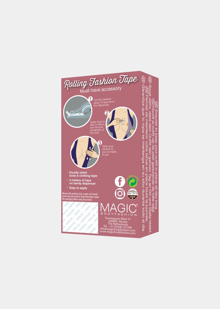 MAGIC's Rolling Fashion Tape zorgt ervoor dat je outfit de hele dag goed blijft zitten. De tape is een zelfklevende dubbelzijdige tape en eenvoudig aan te brengen op de huid of stof. De fashion tape voorkomt dat je outfit afzakt, openspringt of omhoog gaat. Een rol bevat drie meter tape en kan in de gewenste lengte worden geknipt. De Rolling Fashion Tape is een gemakkelijke oplossing om in elke handtas mee te nemen.