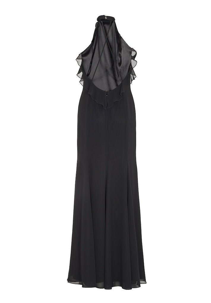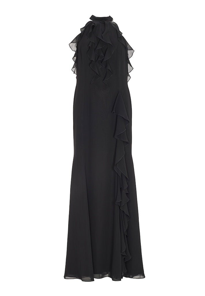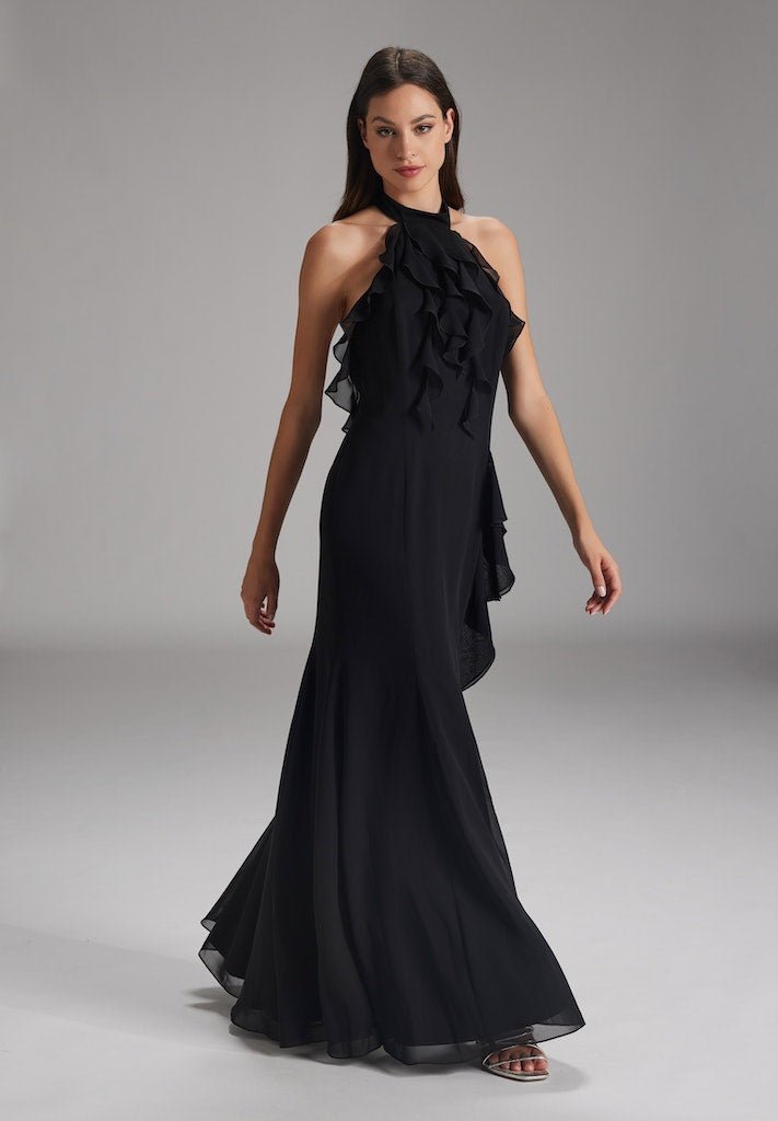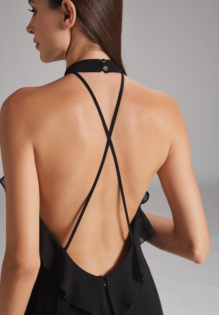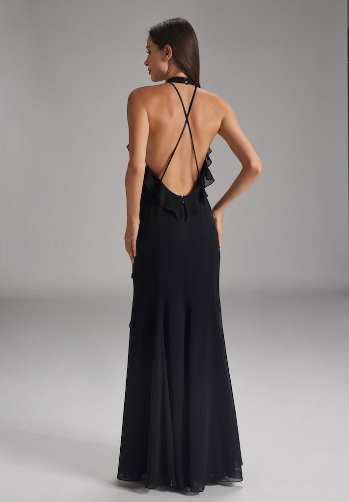 Betreed met onze zwierige maxi-jurk een wereld van moeiteloze gratie en tijdloze schoonheid. Het luchtige chiffon danst rondom de ruffled details, die elegant over de jurk vloeien, terwijl de Amerikaanse halslijn een verfijnde uitstraling toevoegt. De open, lage rug, subtiel versierd met elegante gekruiste koordjes, en de speelse korte split geven deze jurk een sensuele touch die perfect is voor elke bijzondere gelegenheid.