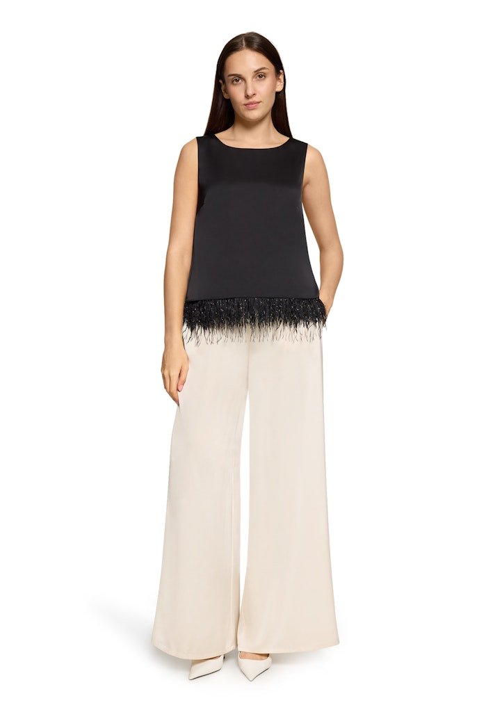 Deze elegante satijnen pantalon straalt luxe en verfijning uit. De soepelvallende satijnstof heeft een subtiele glans en zorgt voor een prachtige, vloeiende beweging bij elke stap. De pantalon is uitgevoerd met een comfortabele tailleband en wijde, rechte pijpen die het silhouet verlengen en een flatterende pasvorm creëren.