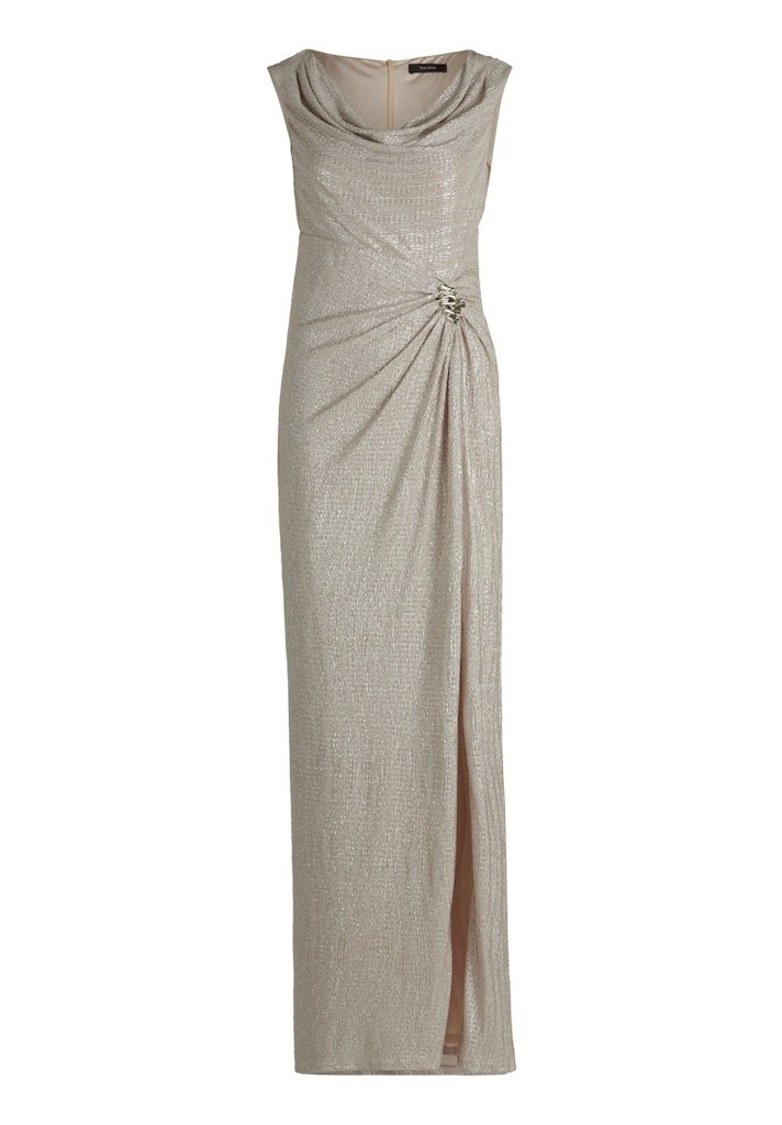 De soepel vallende stof voelt comfortabel aan en volgt het lichaam op een flatterende manier. De gedrapeerde halslijn geeft de jurk een vrouwelijke en zachte uitstraling, terwijl de aangesloten snit het silhouet elegant benadrukt. In de taille zorgen verfijnde plooien en een subtiel decoratief detail aan de zijkant voor een slankmakend effect. De hoge split aan de voorzijde voegt een vleugje sensualiteit toe en biedt extra bewegingsvrijheid.