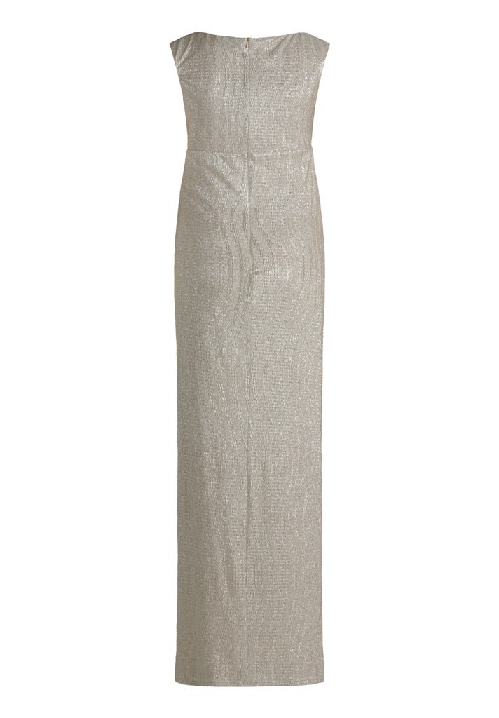 Deze stijlvolle lange avondjurk is een perfecte keuze voor bijzondere gelegenheden waarbij elegantie centraal staat. De jurk is uitgevoerd in een luxe crème-/champagnetint met een verfijnde zilver-gouden metallic glans, die prachtig het licht vangt en zorgt voor een chique uitstraling.