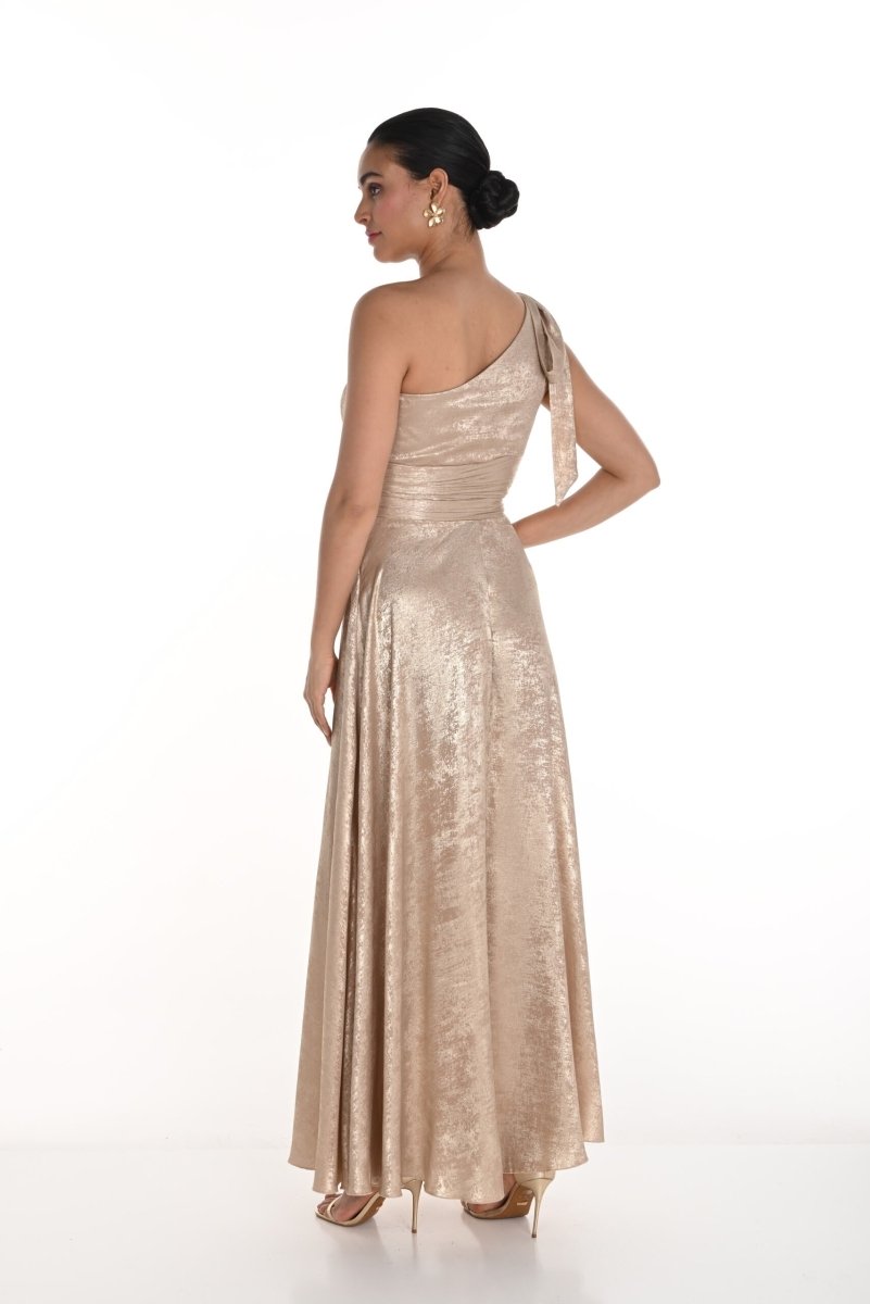 Stap in pure elegantie met deze schitterende maxi jurk in een luxueuze goud-beige tint. De asymmetrische halslijn geeft een speelse, verfijnde touch, terwijl de hoge split een subtiel sensueel accent toevoegt. Dankzij de brede tailleband wordt je silhouet prachtig geaccentueerd, waardoor je taille extra goed uitkomt. De mouwloze snit zorgt voor een luchtige, tijdloze uitstraling, perfect voor elke chique gelegenheid. Of het nu een gala, bruiloft of feest is – met deze jurk straal je klasse en stijl uit!