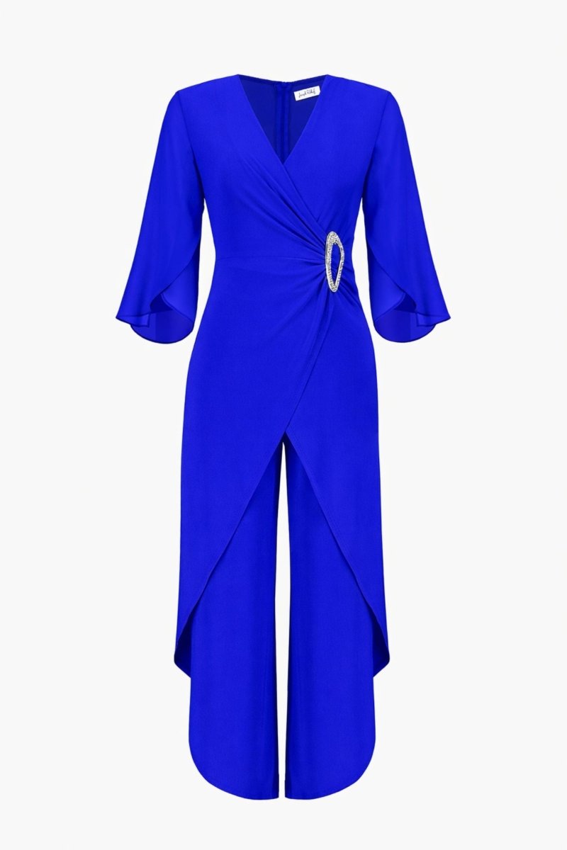 De soepel vallende stof en de driekwart vlindermouwen geven de jumpsuit een luchtige, luxe uitstraling. De wijde pijpen creëren het effect van een jurk, terwijl je geniet van het comfort van een jumpsuit. Ideaal voor feestelijke momenten, bruiloften of een chique diner.