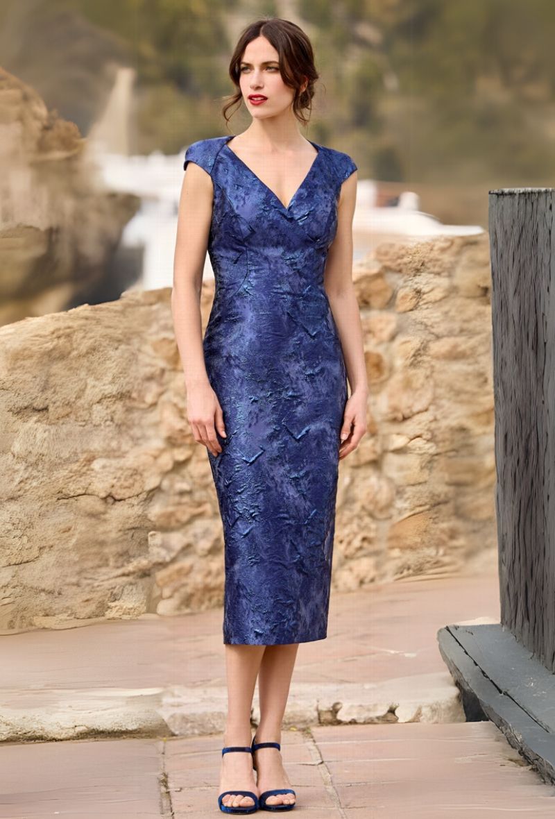 Laat een blijvende indruk achter op de grote dag met deze stijlvolle Sonia Peña outfit. Dit luxueuze kuitlange jurkensemble in een diepe koningsblauwe tint straalt verfijning en klasse uit. De combinatie van een glanzende jacquardrok met een fijne kanten top met driekwartmouwen biedt een perfecte balans tussen elegantie en comfort.