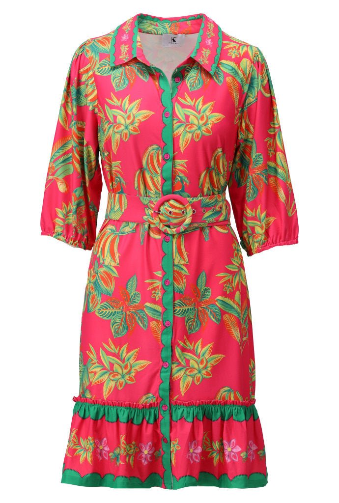 Deze opvallende jurk van K-Design brengt direct een zomerse en energieke uitstraling in je garderobe. De levendige combinatie van felroze met frisse groene accenten en tropische bladeren en bloemen zorgt voor een speelse en exotische look die perfect past bij zonnige dagen en vakanties.