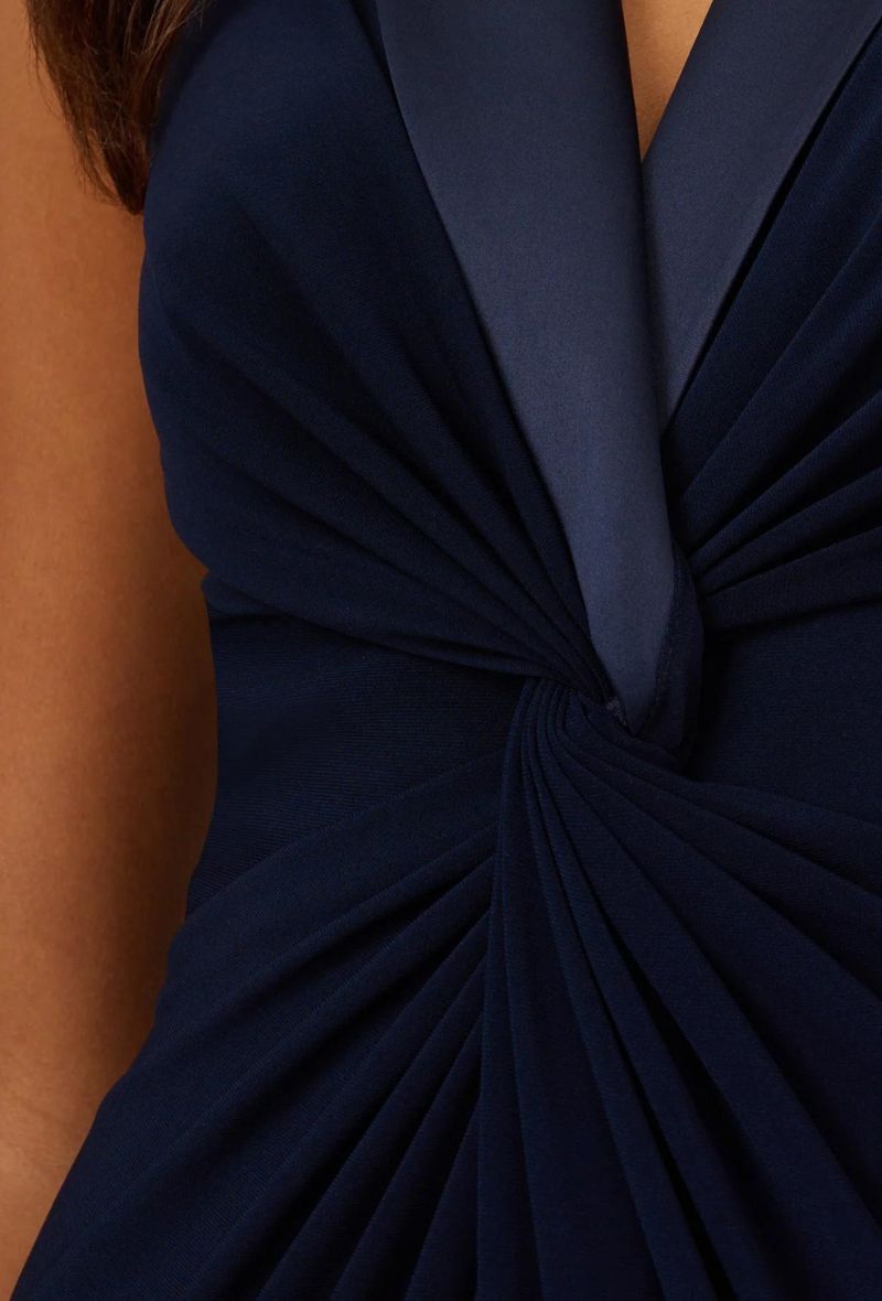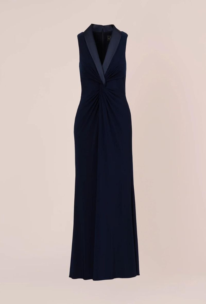 Deze smoking-geïnspireerde avondjurk, gemaakt van verfijnde stretch matte jersey, heeft een flatterend lijfje met een gedraaide voorkant, een overslaghalslijn en een satijnen sjaalkraag. De gerimpelde details aan de achterkant voegen een elegant accent toe. Met een gestroomlijnde ritssluiting aan de achterkant is deze jurk perfect voor bruiloften en black-tie gala's.