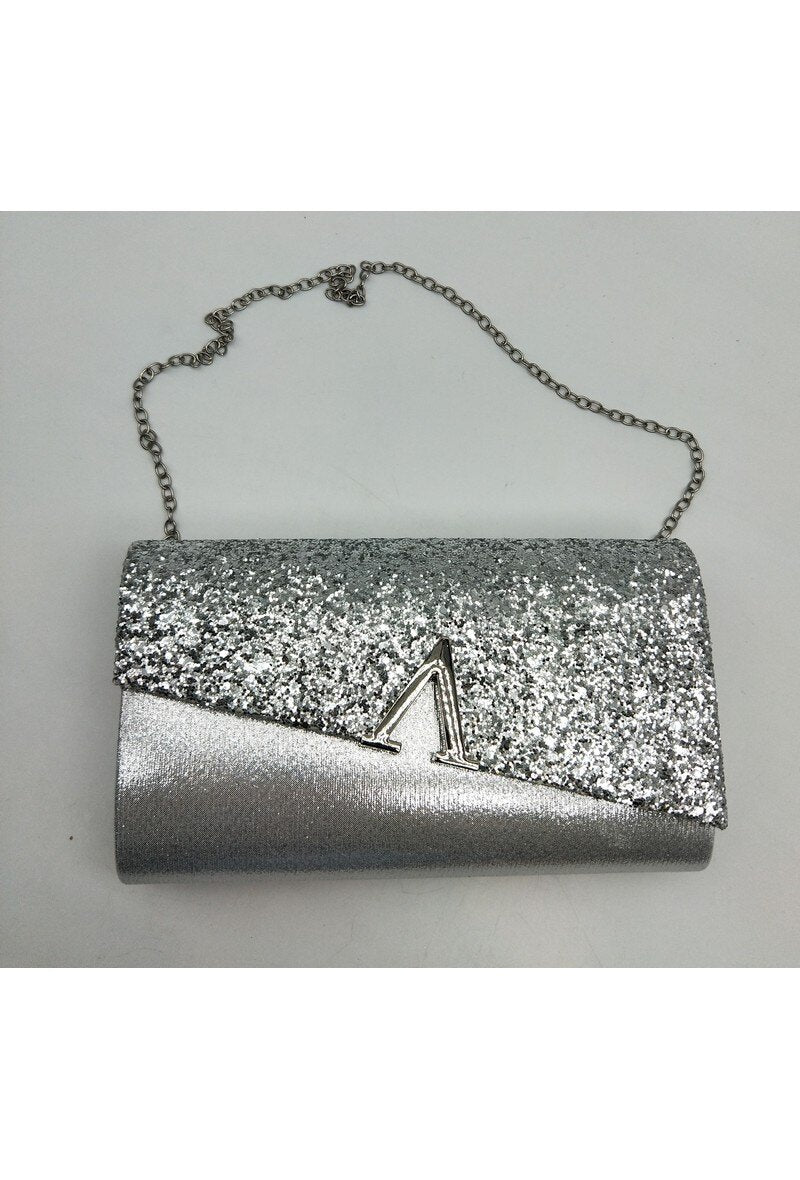 Deze elegante avondclutch is een echte blikvanger dankzij het asymmetrische design met glitterafwerking. De combinatie van een glanzende onderzijde en een sprankelende klep geeft de clutch een luxe uitstraling. Het metalen detail op de voorzijde zorgt voor een chique finishing touch.