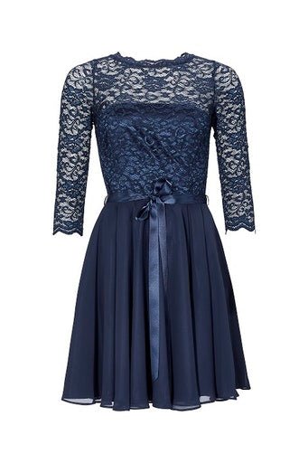 Cocktail jurk geschikt voor iedere feestelijke gelegenheid. De jurk valt rondom de knie, heeft een kanten top en driekwart mouw.