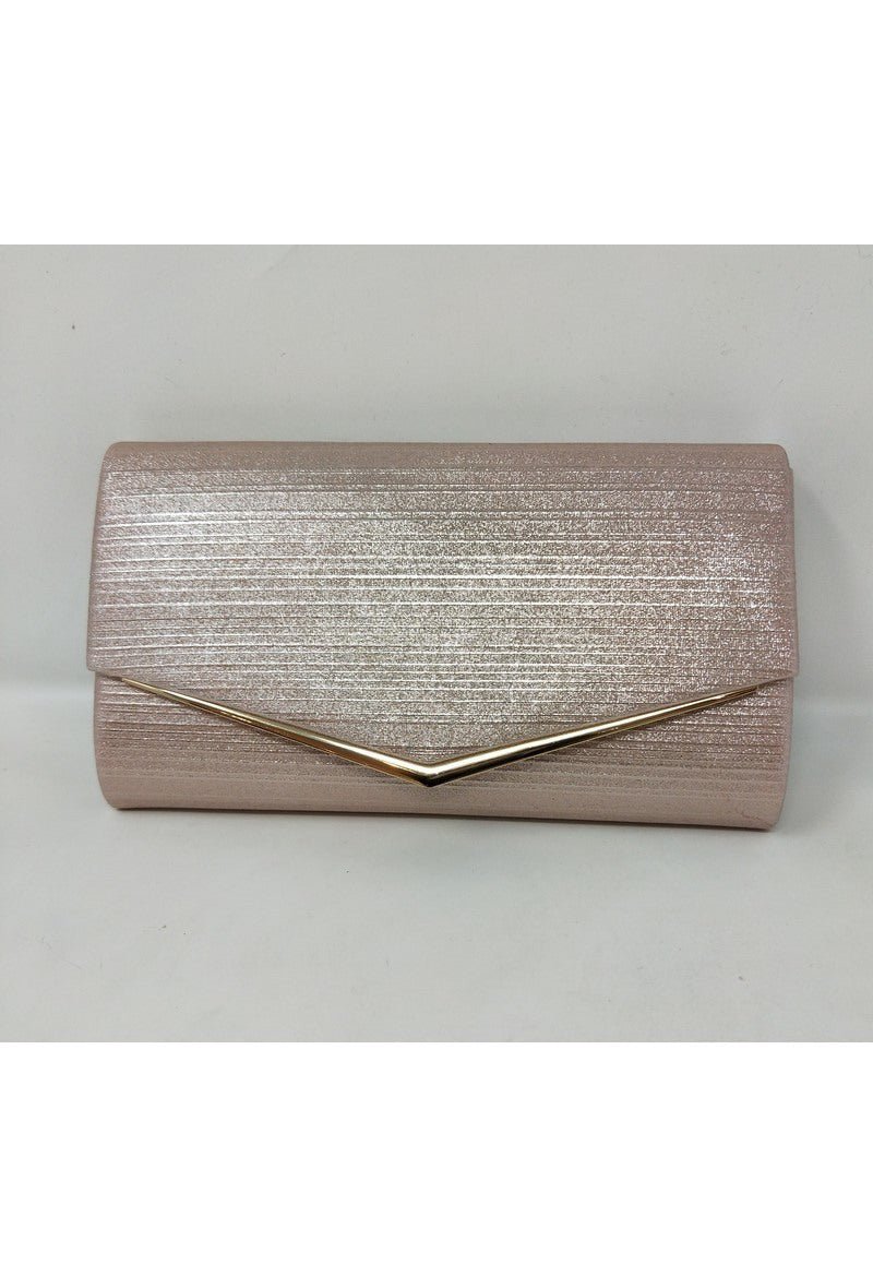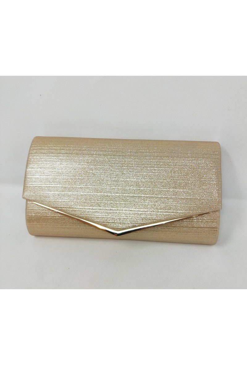 Deze stijlvolle avondclutch is de perfecte finishing touch voor elke feestelijke outfit. De clutch heeft een verfijnde, licht glanzende structuur en is afgewerkt met een chic V-vormig metalen detail op de klep, wat zorgt voor een moderne en elegante uitstraling.