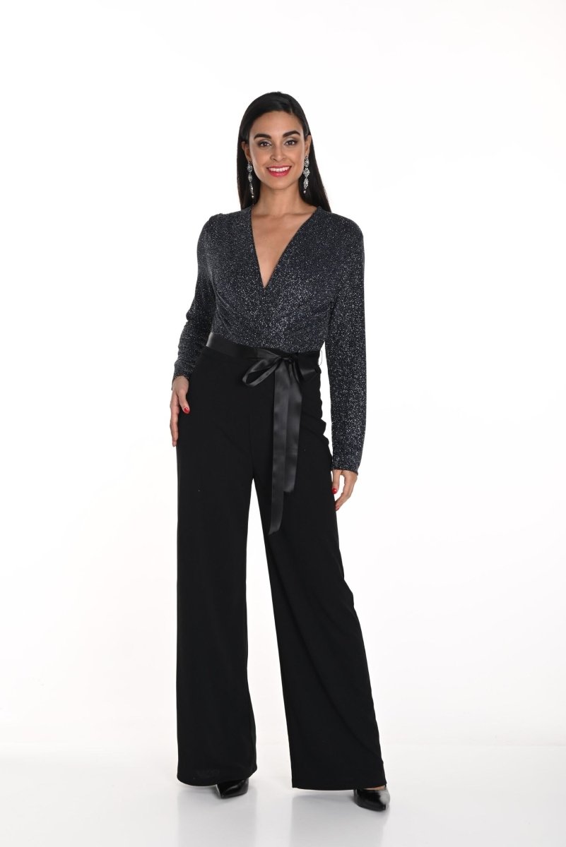 Deze elegante jumpsuit is een perfecte combinatie van stijl en comfort. Het ontwerp heeft een flatterende V-hals en een satijnen tailleband die je silhouet mooi benadrukt. De wijde pijpen zorgen voor een luchtige en moderne uitstraling, terwijl de lange mouwen een verfijnde touch toevoegen. Ideaal voor zowel formele als feestelijke gelegenheden.