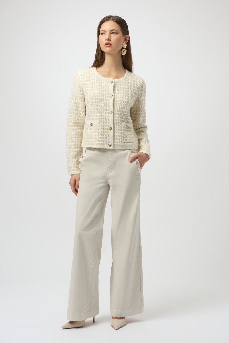 Deze stijlvolle off-white broek van Joseph Ribkoff is een tijdloos item met een moderne twist. De high-waist fit met knoopdetails langs beide zijden geeft de broek een verfijnde en elegante uitstraling. Het rechte, wijde pijpmodel zorgt voor een flatterend silhouet en ultiem draagcomfort.