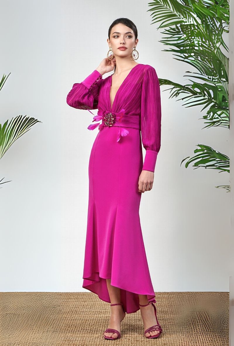 Verrijk je garderobe met deze oogverblindende fuchsia jurk van het Spaanse topmerk Sonia Peña. Deze jurk combineert moderne glamour met klassieke vrouwelijkheid en is dé showstopper voor feestelijke gelegenheden zoals bruiloften, gala’s of chique diners.